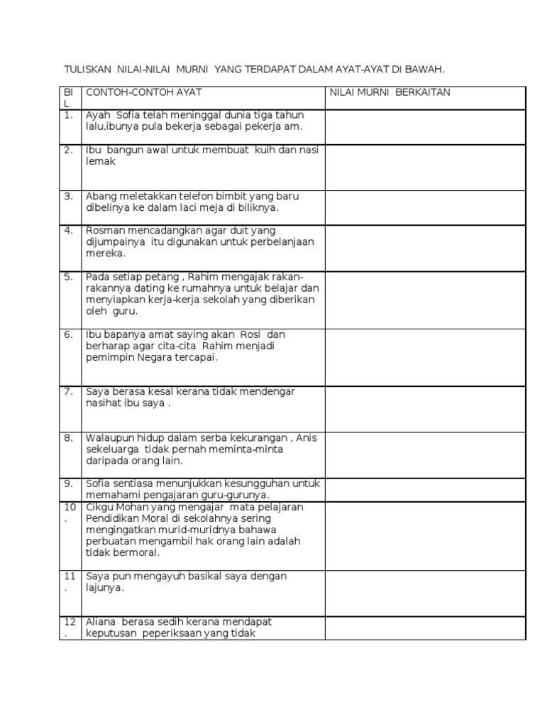 Contoh Ayat Yang Menggunakan Perkataan Nilai Murni